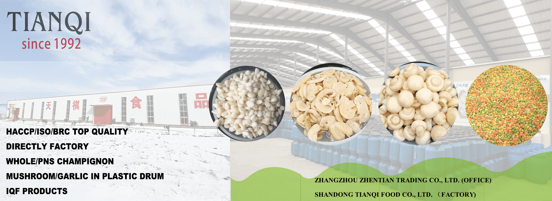 Shandong Tianqi Food Co., Ltd, ovo su tvornice pripadaju Zhangzhou Zhentian Food Co., Ltd. Naša kompanija osnovana je 1992. godine. Specijalizirani smo za gljive i beli luk u bačvama. Pridržavanje prednost preduzeća "Upravljanje integritetom, vrhunskog vrhunskog kvaliteta, prvo". Pružamo visoku kvalitetu, sigurnost, ishranu i zdravlje konzervirane hrane za hranu za međunarodnu konzerviranu tržište hrane, a uvoznici su vjerovali i podržavali u cijelom svijetu.